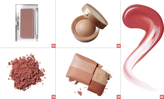 1 슈에무라 글로우 온 블러쉬 M 핑크 31호, 3만3천원. 2 부르조아 블러쉬 ‘브렝 뿌드레’, 2만원. 3 메이블린퓨어 미네랄 블러쉬 ‘트루 피치’ 9천원. 4 겔랑 블러쉬 4 에끌라 02호, 5만9천원. 5 겔랑 러시안 돌. 수채화처럼 표현되는 촉촉한 리퀴드 블러셔. 5만5천원. | |