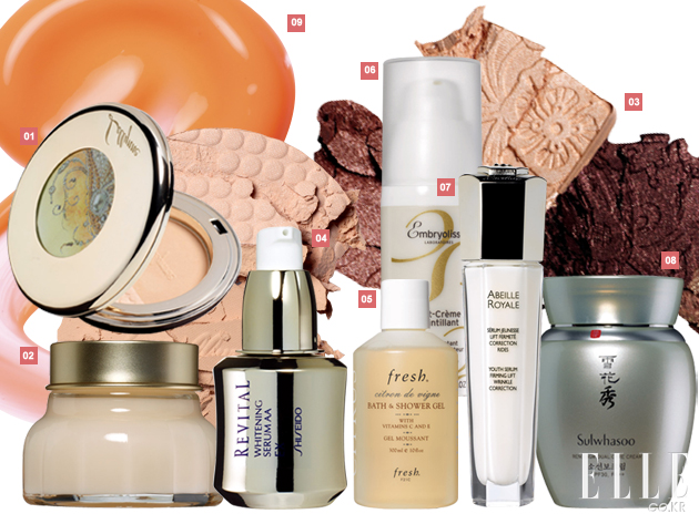 1 롤린느 듀얼 파우더 팩트 팩트를 구입할 때의 가장 중요한 구매 포인트는 픽스 메이크업을 할 때 뜨지 않고 잘 밀착되는가 하는 것이다. 이 제품은 입자가 고와 마치 집에서 바로 화장을 하고 나온 듯 보송보송한 피부 상태가 오랫동안 유지됐다. 가격 미정. 2 스킨푸드 페이셩 워터 비타 A 크림 바르자마자 피부에 즉각적으로 스며들고 수분 공급 효과도 뛰어나다. 피부에 물을 부은 듯 시원한 발림성도 굿. 1만8백원. 3 헤라 엠브로이더리 아이섀도 로즈, 베이지, 브라운, 골드의 네 가지 컬러를 섞어 발랐더니 깊고 그윽한 가을 눈매가 완성됐다. 날림 없이 촉촉한 텍스처라 그러데이션하기에도 좋다. 4만2천원. 4 시세이도 리바이탈 화이트닝 세럼 AA EX 럭셔리한 골드 케이스가 예사롭지 않다 했더니 역시 눈에 띄는 효과가 즉각적으로 나타났다. 피부 컨디션이 안 좋을 때 기도하는 마음으로 발라줬더니 피부 속까지 환해진 느낌. 21만원. 5 프레시 씨트론 드 빈 배스 앤드 샤워 젤 상쾌한 시트러스 향 덕분에 샤워 시간이 즐겁다. 특히 하루에 서너 번씩 샤워해야 하는 요즘엔 건조한 피부 때문에 고민인데 이 제품은 보습 걱정까지 해결해주니 그야말로 완소 아이템. 3만8천원. 6 엠브리올리스 콘센트레이티드 크림 밀크 스파클 메이크업 아티스트의 비밀 병기로 알려진 덕분에 국내에서도 이미 한 차례 유명세를 탄 제품. 60주년을 맞아 제작했다는 이 리미티드 아이템은 골드 스파클이 들어 있어 특히 매력적이다. 3만9천원. 7 겔랑 블랙비 파워 에센스 사용 방법 1단계, 럭셔리한 패키지에서 긴 스포이드를 꺼낸다. 2단계, 세럼을 한 방울 떨어뜨린 뒤 원을 그리며 간단하게 마사지한다. 3단계, 눈에 띄게 주름이 개선되고 탄력이 생긴 내 얼굴을 상상하며 미소 짓는다. 18만1천원. 8 설화수 소선보 크림 이제껏 써 왔던 안티에이징 제품과 달리 이 제품은 낮 시간 동안의 자외선과 열로 인한 피부 손상을 막아준다니 꽤 획기적인 듯. 15만원대. 9 바비 펫 엔젤 블라썸 멀티 틴트, 오렌지 젤 타입의 틴트를 입술과 볼에 톡톡 찍어 발라주니 발그레하니 얼굴에 생기가 돈다. 끈적임이 없어 더운 여름에 사용하기 좋을 듯. 6천8백원. |