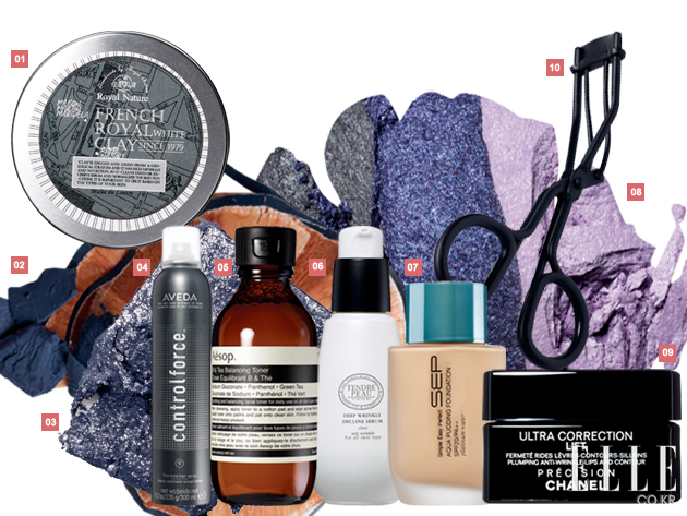 1 로얄네이쳐 프렌치 화이트 클레이 뾰루지가 나서 걱정이었는데 물에 개어 바르니 피지를 쪽 뽑아주는 점이 특히 마음에 들었다. 클레이 마스크 특유의 뻣뻣함이 없고 입자가 고와 사용감이 부드러운 것도 장점. 100g, 3만2천원. 2 부르조아 콜 에 콩뚜르 미네랄, 그레이 블루 콜 타입이라 부드럽게 그려진다는 건 일단 합격. 그레이가 섞인 블루 컬러라 아이라인보다 볼드하게 칠해 아이섀도처럼 표현하는 게 더 좋을 듯. 1만7천원. 3 바비 브라운 데님 스파클 아이섀도 바비 브라운 특유의 진주 펄이 아니라 꽤 입자가 굵은 펄이라 포인트를 주기에 좋다. 블루 아이섀도를 잘못 바르면 눈이 멍든 것처럼 보이는데 빈티지 데님처럼 톤다운된 블루 컬러라 고급스럽다. 3만5천원. 4 아베다 컨트롤 포스 펌 홀드 헤어 스프레이 내추럴한 포니 테일에 꽂혀 있는 요즘 잔머리 정리를 위해선 없어서는 안 될 존재가 됐다. 번들거리거나 덩어리지지 않고 왁스를 바른 듯하지만 홀딩력은 강력하다. 3만6천원. 5 에이솝 비 앤 티 밸런싱 토너 끈적임이 전혀 없는 완벽한 워터 타입 토너라 더운 날씨에도 부담 없이 쓸 수 있다는 게 장점. 로션만 발라도 무겁게 느껴졌는데 화장 전에 솜에 듬뿍 적셔 올려두면 모이스처라이저가 필요 없을 정도로 촉촉하다. 가격 미정. 6 땅드르포 딥 링클 디클라인 세럼 발효 콜라겐 성분 때문인지 독특한 냄새가 나는데 금방 사라져 부담스러운 정도는 아니다. 주름이 당장 없어지는 건 아니지만 물처럼 가볍고 촉촉하게 스며들고 끈적임이 남지 않아 마음에 든다. 12만5천원. 7 셉 아쿠아 푸딩 파운데이션 수분이 풍부한 텍스처라 푸딩처럼 탱글탱글한 감촉이 드는데 많이 발라도 스펀지로 조금만 두드리면 금세 매끈하게 스며들 정도로 밀착력이 좋다. 유분이 거의 없으니 건성 피부보다는 지성 피부에 추천. 4만원. 8 MAC 미네랄라이즈 아이섀도, 투게더니스 펄이 과하지 않고 실키해 차분한 눈매를 만들어준다. 가루 날림이 없어 렌즈를 끼는 날도 문제 없다. 여름은 물론 가을까지 이어서 쓸 수 있는 쿨한 퍼플 & 그레이 컬러. 3만원 9 샤넬 울트라 꼬렉씨옹 리프트 플럼핑 안티링클 립 앤 컨투어 입술에 바르기엔 너무 호사스러운 게 아닌가 싶기도 하지만 팔자 주름과 입술 잔주름 부위를 실키하게 메워주는 걸 보면 하나쯤 있으면 좋겠다는 생각. 입가만 깔끔하게 정돈해도 인상이 달라지는 걸 보면 더욱 그렇다. 8만8천원. 10 조성아 루나 스키니 뷰러 아이래쉬 컬러를 사용해도 끝은 컬링이 잘 안 되는데 미니 사이즈라 구석구석 컬링할 수 있어 굿. 1만원.