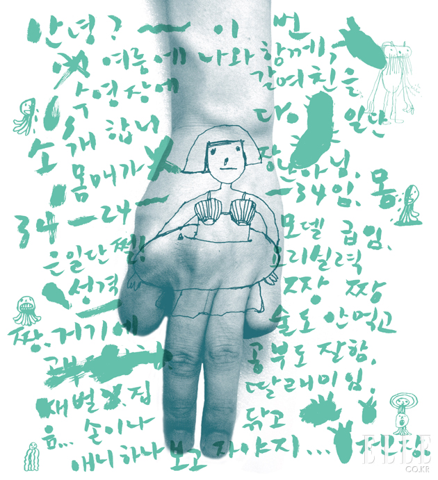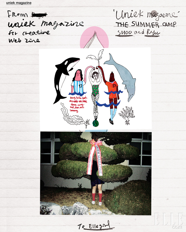 1 류은지. 독립 잡지 을 만드는 사람. 현대미술 작가. www.uniek-magazine.com 2 2년 전 우리는 카페에서 이야기를 나누고 있었다. 그날도 여름. “뭔가 재밌는 걸 하고 싶다”는 이야기가 시작되었다. 사람들과 우리의 작업을 소통할 수 있는 방법은 무엇일까? 답은 간단했다. ‘보여주기’. 방 안에 꽁꽁 묶어둔 예술이 쉽고, 유쾌하게 즐길 수 있는 문화가 되기를 바랐다. 그래서 우리는 매우 ‘유니크한’ 잡지를 만들었다. 그것이 <유니크 매거진>이다. 3 여름엔 ‘여름캠프’. 캠프는 하나의 집단이다. 아주 소규모 집단인 캠프는 어느 날 약속한 듯 만나 놀곤 각자의 위치로 돌아간다. 이는 마치 독립 잡지를 만드는 우리들 같다. 우리는 재정적인 문제 때문에 매일 캠프파이어를 할 수가 없다. 창작적 유희를 함께하기 위해 모인 사람들이 불을 지르듯 한 권의 잡지를 만든다. 그리고 곧 흩어진다. 돈 벌러 가야 하니까. 4 여름은 노출의 계절인데 왜 <엘르걸>엔 노출 수위가 있을까. 소녀들도 알 건 다 안다. 표현에 자유를 주길. 5 활동적이지 않은 나는 여름이 두렵다. 모두가 ‘액티비티’를 외치며 거리로 쏟아져 나오니까. 차가운 걸 많이 먹어 장에 탈이 난 듯한 느낌이랄까. 지구는 이미 탈난 것 같다. 이렇게 더운 걸 보니. |