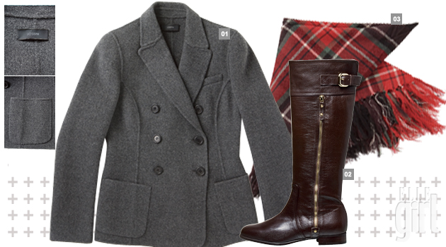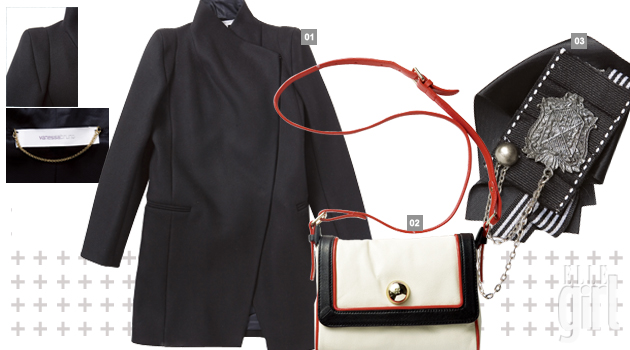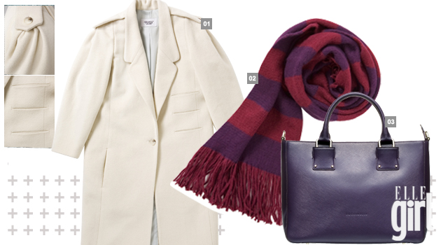 무릎길이의 테일러드 코트는 하나만으로도 격식을 갖춰 입은 것처럼 보이는 힘을 가졌지요. 견장으로 어깨에 힘을 실어주면서 자칫 딱딱해 보일까 봐 주름 장식을 더해 유연함을 주었지요. 뒷면엔 트렌치코트처럼 케이프 백이 달려 있어요. 입었을 때 소매가 짧은 느낌이 들지만 때가 잘 타는 부담스러운 화이트 컬러인 것을 생각하면, 오히려 소매가 짧은 것이 오염에 대한 부담을 덜어주죠. 어깨가 다소 넓어 보이니 ‘입는다’는 느낌보단 ‘걸친다’는 느낌으로 입었을 때 가장 멋스러워요. 원버튼 코트는 대개 A라인이지만, H라인의 실루엣으로 밀리터리풍 스타일링에 더 적합한 디자인이에요. 닥터백처럼 각진 토트백은 시크한 밀리터리 무드를 연출하게 도와줄 유용한 친구죠. 넓은 어깨가 부담스럽다면, 긴 머플러로 시선을 세로 방향으로 분산시키는 것도 좋은 방법입니다. 데님 팬츠도 잘 어울리는 코트 속에 니트 풀오버와 체크 셔츠를 레이어드해 입는다면 그깟 겨울바람쯤은 문제없어요.