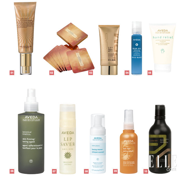 1 피부 결점 및 주름탄력, 자외선 보호에도 효과적인 프레스티지 끄렘 데스까르고 비비 크림. 2만2천원, IT’S SKIN. 2 느슨한 피부를 탄력있게 가꿔주며 지친 피부에 생기를 부여하는 셀톡스 마스크 시트. 1만원, IT'S SKIN. 3 피부 보습 및 영양 성분으로 외부 자극으로부터 지친 피부의 활력을 되찾아 주는 투피엠 선 블록 SPF 50+, PA+++. 1만4천원, IT'S SKIN. 4 두피에 쿨링 효과와 상쾌함을 주는 블루 오일 밸런싱 컨센트레이트. 1만9천원, 아베다. 5 손에 보습 보호막을 형성하여 노화와 건조를 막아주는 핸드 릴리프. 3만8천원, 아베다. 6 천연 장미수가 피부 상태를 조절하고 탄탄하게 만들어주는 보테니컬 키네틱스 스킨 퍼민 토닝 에이전트. 3만8천원, 아베다. 7 자극 없이 순하고 모공 깊숙한 곳의 피지와 노페물을 제거해주는 아우터피스 포밍 클렌저. 3만8천원, 아베다. 8 풍부한 습윤 성분과 방수 성분, 식물성 선블록 성분이 입술을 보호해주는 립 세이버 에스피에프 15. 1만5천원, 아베다. 9 가볍고, 물에 녹지 않는 모발 자외선 차단 스프레이 썬케어 프로텍티브 헤어 베일. 3만2천원, 아베다. 10 두피와 모발에 진정과 안정 작용으로 최상의 건강을 유지하는 아베다 맨 퓨어 포먼스 샴푸. 2만8천원, 아베다.