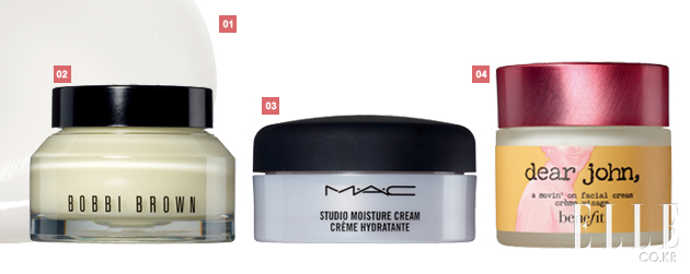 2 바비 브라운 비타민 인리치드 페이스 베이스. 8만3천원. 탱글탱글한 슈크림 텍스처라 피부에 부드럽게 발리고 유수분을 모두 공급한다. 바로 파운데이션을 발라도 들뜨지 않아 아침 메이크업 시간을 단축시켜주는 고마운 아이템. 3 MAC 스튜디오 모이스처 크림. 4만7천원. 수분 크림치고는 리치한 크림 타입. 즉각적으로 피부에 수분을 공급해 메이크업이 잘 받는 피부 상태로 만들어준다. 평소 물광 메이크업을 즐긴다면 꼭 장만할 것. 4 베네피트 디어 존. 4만8천원. 보들보들한 질감으로 끈적임 없이 촉촉함만 남겨주는 기특한 크림. 풍성한 사용감과 매끈한 마무리감의 메이크업 아티스트들의 ‘잇’ 크림. |