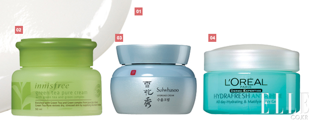 2 이니스프리 그린티 퓨어 크림. 1만5천원. 유기농 그린티 추출물이 수분막을 형성하는 수분 크림. 투명한 젤 타입이라 냉장고에 넣고 차갑게 사용하면 더욱 상쾌하다. 피부 속부터 수분감을 느낄 수 있다. 3 설화수 수율 크림. 10만원대. ‘엄마 브랜드’라는 고정관념을 깨고 향도, 텍스처도 한결 산뜻해졌다. 쿠션감이 느껴지는 가벼운 크림 타입. 쉽게 달아오르는 피부에 강력 추천. 4 로레알 파리 이드라 후레시 안티샤인 올데이 하이드레이팅&매티파잉 아이씨 젤. 2만5천원. 찬물로 세안한 듯 피부가 시원해지는 쿨링 효과! T존 부위가 번들거리지 않도록 해주는 안티샤인 효과도 탁월하다. |