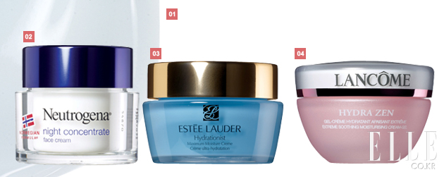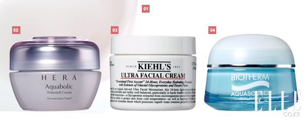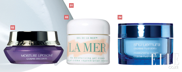 2 코스메 데코르테 모이스처 리포솜 크림. 12만원.수분을 캡슐 형태로 만들어 끊임없이 피부에 영양을 공급한다. 메이크업을 자주 바꾸느라 트러블이 잦은 모델들에게 사랑받는 파우치 속 아이템. 3 라 메르 모이스처라이징 젤 크림. 18만원. 마니아 층이 있을 정도로 입 소문난 ‘크렘 드 라 메르’의 라이트 버전. 건조한 볼에도, 번들거리는 이마에도 두루 사용할 수 있다. 4 슈에무라 딥씨 하이드 라빌리티 모이스처 라이징 크림. 7만5천원. 로션처럼 가벼워 퍼짐성이 좋다. 조금만 발라도 얼굴 전체를 감싸는 느낌.베이스 혹은 나이트 크림으로도 사용 가능.