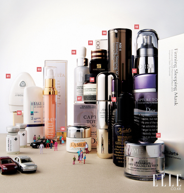 1 빛에 반응하여 주름과 미백 관리에 효과적인 닥터레이 라이트 에너지 앰풀. 5ml×8. 9만9천원. 진피층을 활성화하는 붉은 파장을 이용한 안티에이징 기기, 닥터레이 라이트 에너티 액티베이터. 9만5천원. 모두 CNP차앤박. 2 클렌저, 토너, 컨트롤 제품(미백, 각질 제거, 탄력 부여 3종), 자외선 차단제 등 총 여섯 가지 제품으로 구성되어 18주 동안 피부 세포 기능과 순환을 강화해주는 누덤 시스템. 6종 세트. 58만원. 오바지. 3 견고함과 탄력이 떨어지는 피부에 자연스러운 볼륨감과 리프팅 효과를 전해주는 글로벌 퍼밍 세럼. 30ml. 45만원. 시슬리. 4 쿨링 효과를 주어 눈가 피로를 줄여주고 아이백을 예방하는 실버 팁 애플리케어터가 내장된 아이밤 인텐스. 15ml. 19만원. 라메르. 5 눈에 띄는 주름과 자외선에 의해 노화된 세포의 재생을 도와주는 리페어웨어 레이저 포커스 링클&포토 데이지 코렉터. 30ml. 8만5천원. 크리니크. 6 눈가 주름, 부기, 다크서클, 건조함 같은 노화 현상을 완화해주는 어드밴스드 나이트 리페어 아이 싱크로나이즈드 콤플렉스. 15ml. 9만원. 에스티 로더. 7 항염, 항균, 항산화 효과가 피부 재생을 도와주어 생기와 활력을 부여하는 퍼펙트 페이셜 하이드레이팅 크림. 60ml. 가격 미정. 에이솝. 8 주름 개선, 탄력 증진, 영양 공급, 보습, 생기 부여 효과가 있는 에이지엑스 퍼밍 슬리밍 마스크. 50ml. 4만8천원. 닥터 자르트. 8 노화된 섬유아세포에 활력을 전달하여 피부 탄력을 높여주는 바이오 퍼포먼스 수퍼 코렉티브 세럼. 30ml. 14만원. 시세이도. 10 피부줄기세포 활성화의 핵심 성분이 주름과 미백 효과를 제공하는 셀파워 넘버원 에센스. 35ml×2. 10만원대. 오휘. 11 밤 시간 동안 항산화 물질 생성을 촉진하고 피부 방어력을 높여주는 캡춰 토탈 인텐시브 나이트 리스토러티브 크림 & 리치 크림. 50ml. 16만5천원. 크리스챤 디올. 12 1%의 수분도 넣지 않은 고농축 나이트 재생 오일 미드나잇 리커버리 콘센트레이트. 30ml. 6만5천원. 키엘. 13 부기와 다크서클을 눈에 띄게 줄여주고 주름을 완화해주는 레네르지 리프트 볼류매트리 리프팅 앤 퍼밍 아이 크림. 15ml. 9만2천원. 랑콤.