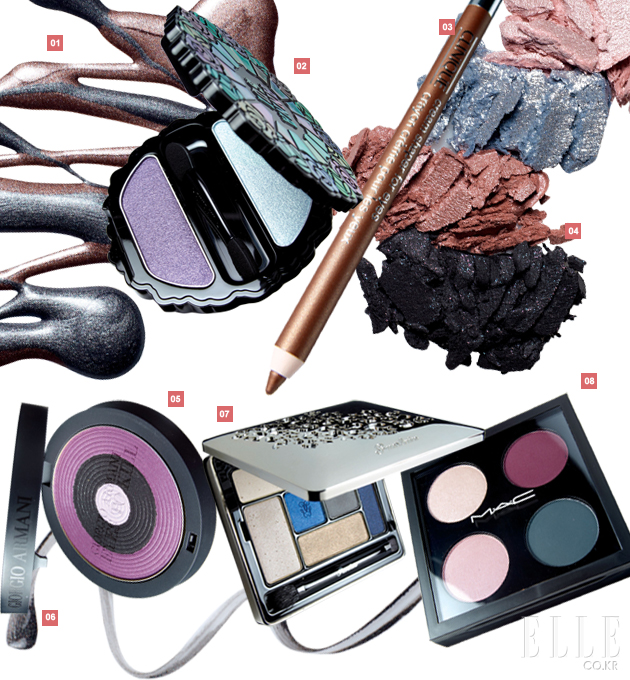 1 부르조아 수이베 몽 르갸르 리퀴드 아이섀도, #34 클리어 이리데썽 토푸, #35 실버리 그레이 위드 어 블루틴트. 각 2만7천원. 2 안나수이 아이 칼라 듀오, 06 미스터리어스 블루 뉘앙스. 4만4천원. 3 크리니크 크림 쉐이퍼 포 아이즈, 06 초콜릿 러스터. 2만4천원. 4 랑콤 옹브르 압솔뤼 쿼드 팔레트 룸에센스, A50 메트로폴리탄 핑크, 6만8천원. 5 조르지오 아르마니 아이즈 투 킬 팔레트, No.7. 6만9천원대. 6 크리스챤 디올 스타일 라이너. 3만9천원. 7 겔랑 에끄레 6 꿀뢰르, 2 플레이스 방돔. 9만9천원. 8 MAC 펠리스 페디그리드, 코틀리, 펠리스 페디그리드, 콰이트 스포일드, 러시안 블루. 6만원.