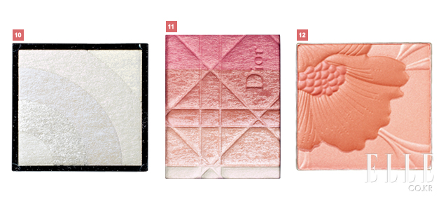 10 pale Skin 라네즈 스노우 크리스탈 블러셔, 01호 하이라이트 그라데이션. 3만원대.핑크, 옐로, 라벤더 등의 펄 파우더는 흰 피부를 더욱 희고 투명해 보이게 하는 효과가 있다. 이마, 눈밑, 콧잔등 등 볼륨이 필요한 부위를 터치해줄 것. 11 yellow Skin 크리스챤 디올 스킨 쉬머 파우더, 001호 로즈 다이아몬드. 5만7천원. 미세한 펄감이 하이라이터 효과를 겸한다. 네 가지 컬러를 피부 톤에 따라 그러데이션해서 발라볼 것. 밀착감이 특히 좋아 동동 떠보이지 않는다. 12 dark Skin 크리니크 프레시 블룸 올오버 컬러, 06호 카멜리아. 4만원. 컬러가 진해 보이지만 밝은 컬러는 하이라이터로, 브라운 컬러는 섀딩 블러셔로 쓰기에 좋다. 태닝한 피부를 건강하게 돋보이게 할 때 좋을 듯. 거울이 큼직한 것도 장점. |