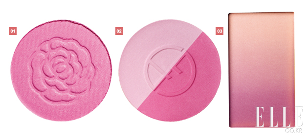 1 pale Skin 안나 수이 페이스 칼라 액센트G, 350호. 3만2천원.채도가 높은 딸기 우유 핑크 컬러라 흰 피부가 더욱 돋보이는 효과가 있다. 발색력이 좋아 한두 번만 쓸어 발라도 또렷한 핑크 빛이 되므로 양 조절에 신경 쓸 것. 2 yellow Skin 조르지오 아르마니 시어 블러쉬 듀오. 5만4천원.핑크 블러셔를 매치하기 쉽지 않은 노르스름한 피부도 금세 화사해지는 컬러. 두 가지를 믹스해서 바르면 자연스럽게, 진한 컬러만 바르면 비비드하게 연출할 수 있다. 3 dark Skin 에스티 로더 시그너처 실키 파우더 블러시, 06호 플럼 뉘앙스. 4만7천원.까무잡잡한 피부에 딸기 핑크 같은 채도 높은 컬러는 오히려 역효과를 줄 수 있다. 톤다운된 플럼 컬러라 튀지 않으면서도 피부 톤을 자연스럽게 잡아준다. |