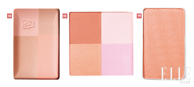 4 pale Skin 겔랑 블러쉬 4 에끌라, 07호 카레스 드 로브. 6만2천원. 톤다운된 핑크와 코럴, 베이지 컬러가 섞여 있어 믹스해 바르기 좋을 듯. 한 듯 안한 듯 은은하게 연출된다. 내장된 브러시도 부드럽고 겔랑 특유의 고급스러운 향도 굿. 5 yellow Skin 헤라 엠브로이더리 블러셔&셰이딩. 가격 미정.혈색과 페이스 라인을 동시에 살릴 수 있는 멀티 블러셔. 베이스 컬러인 라벤더 핑크가 노르스름한 피부를 화사하게 연출해주므로 중간 피부 톤에게 잘 어울린다. 6 dark Skin 슈에무라 글로우 온 P 핑크 36D. 3만3천원. 코럴에 가까운 연한 오렌지 컬러 블러셔를 뺨 앞쪽을 중심으로 둥글게 바르면 장난스러운 분위기를 연출할 수 있다. 까만 피부도 사랑스럽게 연출할 수 있는 베스트 컬러. |