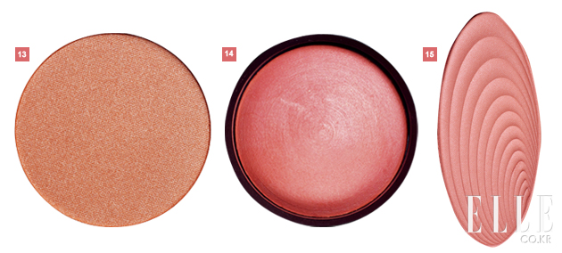 13 pale Skin MAC 시어 톤 시머 블러셔, 트레이스 골드. 3만원.창백한 피부에 건강함을 더해주는 브론즈 브라운 컬러. 커다란 파우더 브러시로 전체적으로 터치해주면 남국에서 휴가를 보내고 온 젯셋 룩을 연출할 수 있다. 14 yellow Skin 샤넬 쥬 꽁뜨라스뜨, 60호 로즈 템테이션. 5만8천원. ‘역시 샤넬’이라는 느낌이 드는 고급스러운 장미 향. 관자놀이 아래부터 볼 아래쪽까지 사선으로 바르면 시크한 파리지앵 룩 완성. 단, 가루 날림이 살짝 있으니 가볍게 터치할 것. 15 dark Skin 시세이도 더 메이크업 액센츄에이팅 파우더 블러시, B5호 디피스트 로즈. 3만6천원.핑크 톤을 띄는 브라운 컬러라 자연스러운 섀딩이 가능하다. 브러시 폭은 좁지만 프로페셔널 브러시처럼 충분히 부드러워 펴바르기에도 좋다.