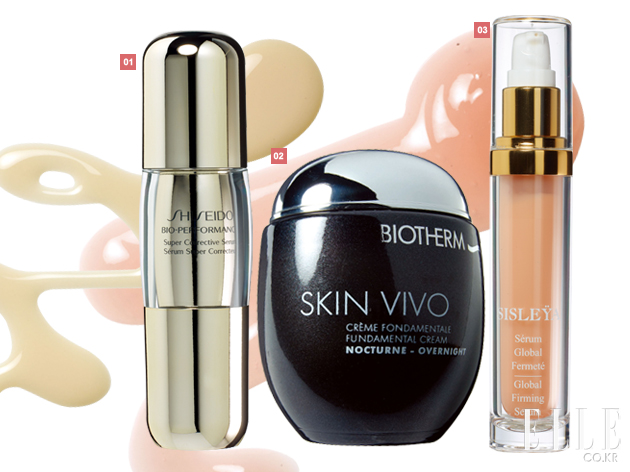 1 시세이도 바이오 퍼포먼스 수퍼 코렉티브 세럼. 14만원. 2 비오템 스킨 비보 리버시브 오버나이트 크림. 9만5천원. 3 시슬리 시슬리아 글로벌 퍼밍 세럼. 45만원. |