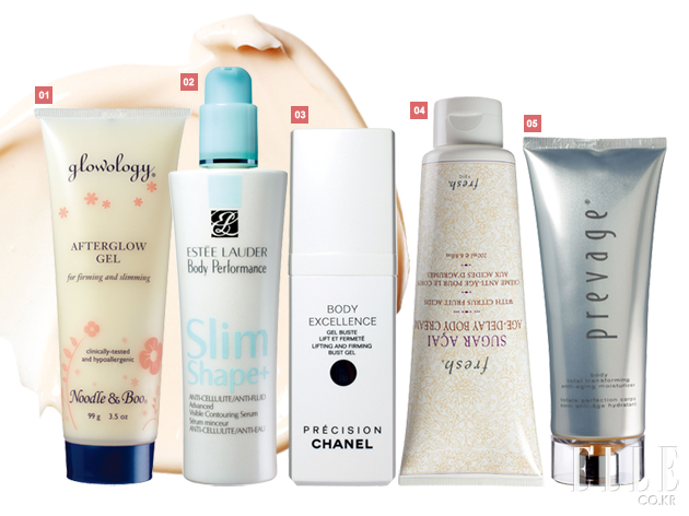 1 누들앤부 애프터글로젤. 7만2천원. 2 에스티 로더 바디퍼포먼스 어드밴스드 비저블 컨투어링 세럼. 6만5천원. 3 샤넬 보디 엑셀렝스 리프팅 & 퍼밍 바스트 젤. 9만8천원. 4 프레쉬 슈가 아사이 에이지 딜레이 바디 크림. 12만5천원. 5 엘리자베스 아덴 프리베이지 바디 토탈 트랜스포밍 안티에이징 모이스쳐라이저. 16만원. |