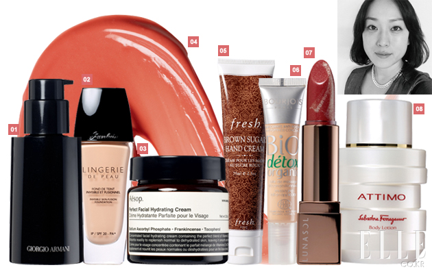 공인아(beauty editor) 1 조르지오 아르마니 스킨 미네랄 포 맨 포티파잉 세럼 꽤 취향 까다롭다는 모 선배에게 선물했더니 끈적임 없고 퓨어한 잔향이 특히 만족스럽단다. 7만6천원. 2 겔랑 란제리 드 뽀 인비져블 스킨 퓨전 파운데이션 SPF 20/PA+ 결점을 찾아볼 수 없는 완벽한 스킨이 올 시즌 트렌드라 했던가. 이렇게 똑똑한 제품이 몇 개만 더 나와준다면 충분히 도전해볼 만하겠다. 극소량만 발랐을 뿐인데 엄청난 커버력을 보여주는 것이 놀라울 따름. 7만원. 3 에이솝 퍼펙트 페이셜 하이드레이팅 크림 뚜껑을 열자마자 향에서부터 남다른 포스가 느껴졌다. 성분을 확인해 봤더니 역시나 비타민의 결정체. 꾸준히 바를 수밖에 없게 만드는, 내 안의 어떤 의지를 불러 일으키는 크림이랄까. 가격 미정. 4 샤넬 루쥬 알뤼르 엑스트레 드 글로스, 지니 ‘이제 발랄한 립글로스가 어울리는 나이는 지났어’라고 스스로 진단을 내리면서부터 점점 립스틱만 가까이 해왔는데 립글로스와의 재회를 도와준 고마운 제품이다. 특히 부드럽게 입술을 감싸는 느낌이 일품. 브러시 대신 대칭형의 양면 팁이 들어 있어 사용하기 편리한 것도 장점. 3만9천원. 5 프레쉬 브라운 슈가 핸드 크림 지금 내 신체 부위 중 가장 빠른 노화 진행을 보이고 있는 부위를 꼽으라면 바로 손. 그런 이유로 핸드 크림을 고를 땐 무조건 리치한 텍스처가 1순위다. 이 제품은 촉촉함이 오래 지속되는 점도 만족스럽지만 풍선껌처럼 독특한 향이 특히 마음에 든다. 3만2천원. 6 부르주아 비오 데톡스 컨실러 커버력 없는 컨실러도 참을 수 없지만 먼지 박힌 컨실러는 절대 용서할 수 없다. 이런 이유로 손에 묻히지 않고 사용할 수 있는 제품을 선호하는 편인데 이 제품은 롤 온타입이라 일단 합격. 커버력은 말할 필요도 없고 오가닉 성분으로 만들었다니 더 믿음이 간다. 3만원. 7 루나솔 풀 글래머 립스틱 S, 딥 로즈 레드 한마디로 딱 가을용 립스틱. 촉촉하고 크리미한 텍스처에 컬러도 예쁜 와인 색. 다만 표면의 오로라이즈 펄은 어떤 용도인지 의문스럽다. 3만9천원. 8 살바토레 페라가모 아띠모 보디 로션 향수와 함께 출시되는 보디 제품들은 간혹 패밀리 고유의 향이 너무 강해서 부담스러운 경우가 있는데 아띠모는 그 적정선을 넘지 않은 점이 마음에 든다. 가까이 다가와야만(!) 느낄 수 있을 만한 은은한 향이 오래 지속된다. 6만4천원.