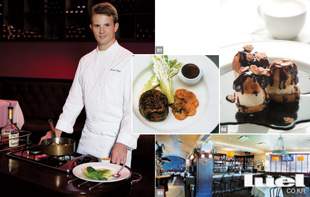 1 초콜릿 프로피트롤 2 비프 필레 플랑베 3 레스토랑 내부