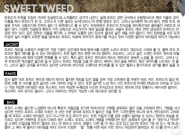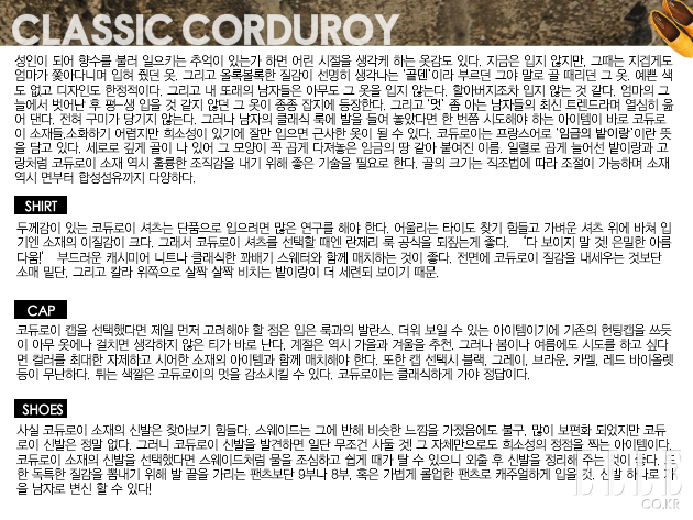 남자는 두 가지로 나뉜다. 가을을 아는 남자와, 가을을 모르고 배부르게 살만 찌우며 황금기를 지나치는 남자로. ‘멋’ 좀 부리는 가을 남자들을 위한 특별한 만남. 그 끝엔 코듀로이와 트위드가 있다.