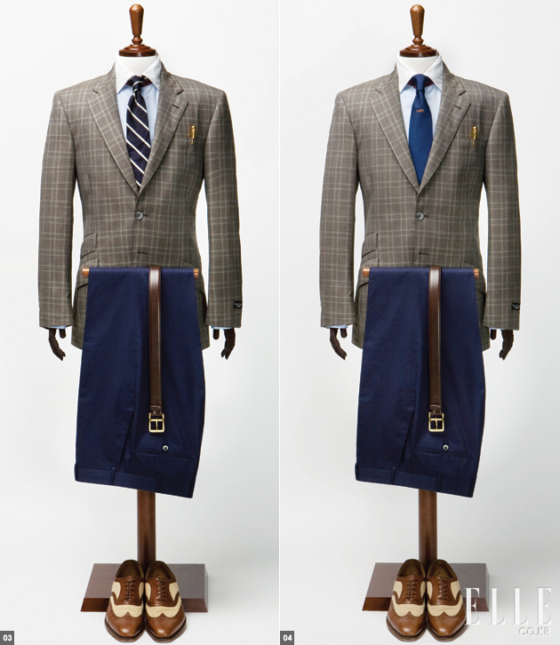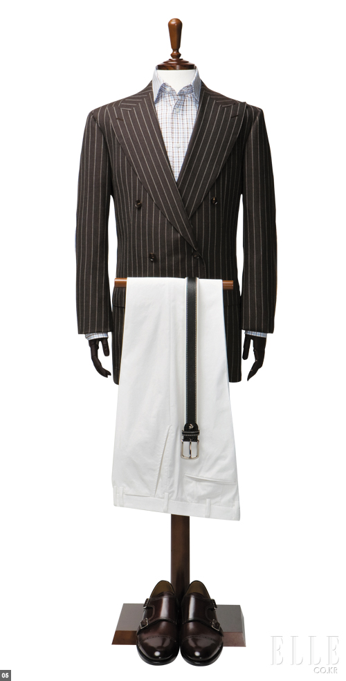5 OFF FORMAL 더블 재킷은 포멀한 성격이 강한 아이템이지만 반드시 엄격하게 갖춰 입으라는 법은 없다. 때론 느슨한 듯 덜 갖춰진 스타일이 더 자연스러운 멋을 내는 법이니까. 가령 셔츠에 타이를 매지 않는 것만으로도 더블 재킷의 답답함은 사라지고 한결 여유로워 보일 수 있다. 단 옷이 편하다고 해서 행동마저 가벼워지는 것은 금물이다. 브라운 스트라이프 더블 재킷 2백70만원 란스미어 브라운 체크 셔츠 12만8천원 지오지아 화이트 치노 팬츠 29만원 라 피규라 네이비 벨트 10만원대 카운테스마라 더블 몽크 스트랩 슈즈 1백80만원 발리 |