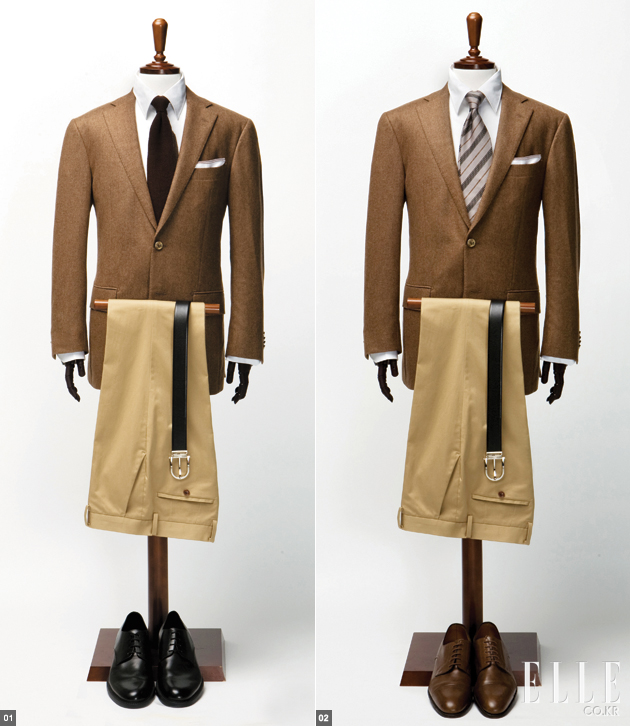 ON FORMAL 1 네이비 컬러가 신뢰와 경쾌한 이미지의 상징이라면 브라운 컬러는 정중하고 차분한 분위기를 자아내는 색이다. 가을을 부르는 부드러운 포멀 룩을 연출할 때 브라운 재킷이 자주 호명되는 건 그 때문이다. 재킷, 타이, 팬츠 등을 브라운 톤으로 연출하면 한층 더 지적이고 기품 있는 룩이 된다. 브라운 울 재킷 가격미정 니나리찌 맨 화이트 셔츠 30만원대 블랙 벨트 40만원대 모두 알프레드 던힐 브라운 치노 팬츠 13만8천원 지오지아 브라운 포켓 스퀘어 7만7천원 시모노고닷 by 일 치르꼬 브라운 니트 타이 30만원대 불가리 블랙 레이스업 슈즈 가격미정 에르메네질도 제냐