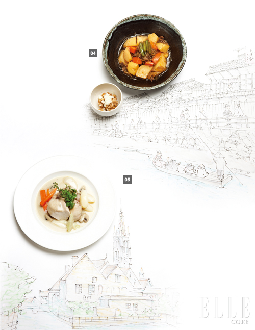 5 Size doesn't matter 브렌 랄뢰, 헨트식 닭고기 요리 내가 태어난 고향의 주민 수는 100명 남짓이었다. 그러니 당신의 질문은 틀렸다. 벨기에는 아주 작은 나라고, 벨기에 국민에게 그런 질문을 할 때는 ‘고향 요리’가 아닌 ‘나라의 요리’에 대해 묻는 것이 옳다. 벨기에 요리는 북부 프랑스의 영향을 많이 받았고, 메뉴의 70% 이상이 겹친다. 그러나 우리가 프랑스의 미각적 속국이라는 생각은 접어두는 것이 좋다. 대체 누가 그런 이름을 붙였는지 모르겠지만, ‘프렌치’ 프라이의 원산지는 벨기에다. 우리는 신선한 홍합을 크림과 함께 삶은 후 감자 튀김과 먹었다. 프랑스 사람들은 벨기에 음식을 비웃지만, 남프랑스의 지중해 쪽 해안선에 사는 주민들은 하나같이 이 홍합 요리를 아주 좋아한다. 프랑스와 우리의 결정적인 차이는 술잔에 무엇을 따르느냐다. 그들은 와인을 마시고 우리는 맥주를 마신다. 벨기에의 국민은 100만 명에 불과한데, 자국 맥주의 종류는 400여 종이 넘는다. 심지어 요리에도 넣는다. 카르보나드 플라망드(Carbonade Flamande)는 벨기에산 브라운 에일을 넣어 만드는 쇠고기 스튜인데, 이 요리를 모르면 벨기에 사람이 아니다. 오늘 내가 준비한 음식에는 갈색 맥주 대신 검은 후추와 노란 마늘이 들어갔다. 벨기에의 유서 깊은 도시, 헨트(Gand)에서 처음 만들어진 닭고기 요리(Waterzooi De Poulet A La Gantoise)로, 올리브유 대신 크림이나 버터를 많이 쓰는 벨기에의 식문화를 엿볼 수 있다. 닭과 리크, 무, 감자, 양송이버섯을 푹 삶은 후, 담백하게 익은 닭고기 위에 버터와 밀가루, 마늘과 블랙페퍼로 만든 크림소스를 얹었다. 소박하고 정직한 맛은 벨기에 농가의 식탁을 연상시킬 것이다.” 니콜라스 드 비쉬(그랜드 인터컨티넨탈 ‘테이블 34’ 셰프) |