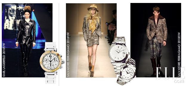 URBAN TIMES 구찌의 크리에이티브 디렉터 프리다 지아니니가 디자인한 여성용 시계 라인 ‘U-PLAY COLLECTION’. 독특한 교체식 디자인을 바탕으로 시계의 라운드 다이얼의 음영 로고와 끝으로 갈수록 점점 가늘어지는 시계 바늘이 특징이다. 또한 구찌 시계의 가장 특징적인 메탈 홀스빗으로 장식되어 브랜드의 세심함도 함께 느낄 수 있다. 작은 모델(지름 27mm)은 스틸 뱅글과 애나멜 소재 및 흰색 도마뱀 가죽 세트 중 선택해 스트랩을 교체 할 수 있으며 큰 모델(지름 35mm)은 화이트 구찌시마 가죽이나 파란 색 타조 가죽, 담자색 러버 및 검정 애나멜 소재 중 선택이 가능하다. 구찌 특유의 모던하고 도시적인 이미지를 그대로 적용, 깔끔한 오피스 룩이나 F/W 시즌 트렌디 컬러인 카멜 색상과 매치한다면 완벽한 조화를 이룰 수 있을 것이다. (핑크러버밴드 : 1백31만8천원, 화이트 구찌시마 : 1백39만8천원, 구찌) |