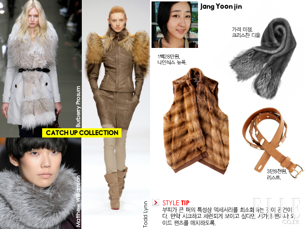 | F/W 시즌 하면 빠질 수 없는 퍼(Fur)! 각양각색의 디자인으로 보온은 물론 스타일 지수까지 올려주는 효자 아이템이다. 그럼에도 '슬림해 보이지 않는다'는 이유로 망설이게 되는 것이 바로 이것. 수많은 컬렉션 중 퍼 소재를 제대로 활용한 디자이너가 바로 크리스토퍼 베일리. 그가 크리에이티브 디렉터로 있는 버버리 프로섬은 이번 시즌 최고의 컬렉션 순위 중 하나로 패션피플의 열렬한 지지를 얻고 있다. 버버리의 대명사 트렌치 코트에 신선한 감성을 불어 넣어 다양한 변화를 시도하는 그가 이번 시즌 주목한 건 퍼를 가미하는 것. 머플러를 두른 듯 길게 늘어진 퍼 트리밍에 벨트로 포인트를 주어 부하게 보일 수 있는 걱정을 단번에 해결했다. 좀 더 유니크한 감성을 지녔다면 주목해야 할 디자이너는 토드 린. 레더와 퍼의 강한 두 소재만으로 액세서리가 필요 없는 시크한 스타일은 완성했다. 그래도 퍼가 부담스럽다면 머플러로 변신한 아이템은 어떨까. 매튜 윌리암슨과 아만다 웨이클리는 퍼 머플러를 목에 살짝 둘러 우아하면서 여성스러움이 가득한 룩을 완성했다. |