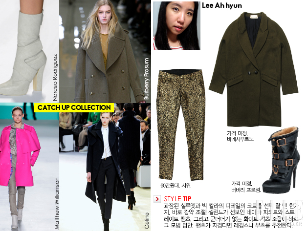 | 레이디라이크룩이 다시 돌아왔지만 아직까지 여성들은 ‘남자’에게 잘 보이고 싶은 옷 보단 자신이 ‘좋아’하는 옷을 입고 싶어 한다. 때문에 붐으로 끝날 것 같던 레깅스도 여전히 불티나게 팔리고 있는데다 스터드와 애니멀 프린트(특히 레오퍼드 패턴) 역시 상한가를 치고 있으며 이번 F/W 시즌의 무시무시한 잇 아이템으로 1순위로 워커가 꼽히는 것이 그 증거다. 그렇다면 베이식한 아이템 코트는? 질 좋은 코트는 수십가지 트렌드을 아우를 수 있는 힘을 가지고 있다. 그렇기에 올 겨울에도 피코트는 반드시 챙겨두어야 할 아이템! 이번 시즌은 실루엣에 변화를 주어 파워와 시크함, 그리고 은밀한 섹시함을 풍겼다. 여자들의 마음을 귀신같이 캐치한 남자 크리스토퍼 베일리, 여성들의 워너비로 떠오른 피비 파일로, 자신의 이름을 내건 컬렉션에 힘을 쏟고 있는 매튜 윌리암스등 코트의 혁명의 반열에 함께했다. |