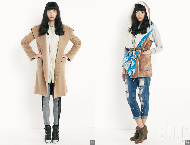 1 박시 데님 셔츠. 8만9천원. 르샵. 클래식한 캐멀 코트. 가격 미정. 아이그너. 시스루 소재가 믹스된 니트 타이츠. 가격 미정. 곽현주 컬렉션. 터프한 버클 장식 스니커즈 힐. 굽 9cm. 30만원대. 아쉬. 2 이빨 프린트 스웨트 셔츠. 10만8천원. 쟈니 바이츠 블루. 양털 소재가 귀여운 무톤 베스트. 29만8천원. T.I. 데미지 데님 팬츠. 10만원대. 제시뉴욕. 보헤미안 스카프. 10만원대. 마리아 꾸르끼. 브라운 벨트. 3만5천원. 숲. 스웨이드 웨지힐. 굽 11cm. 17만9천원. 자라. | |