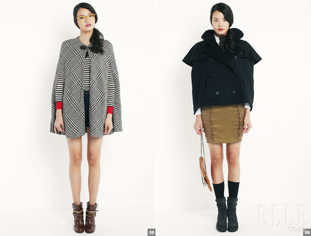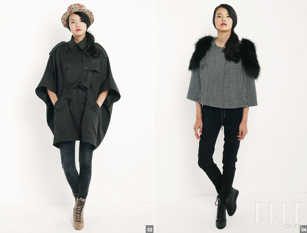3 매니시한 트렌치 모티브의 카키 케이프. 69만5천원. 빈폴 레이디스. 블랙 데님 팬츠. 8만9천9백원. TBJ. 레이스업 부츠. 굽 6cm. 가격 미정. 더슈. 플로럴 해트. 에디터 소장품. 4 어깨에 청키한 퍼가 장식된 지퍼 디테일 헤링본 케이프. 가격 미정. 슬림한 스웨트 팬츠. 21만8천원. 레이스업 웨지 부츠. 굽 9cm. 49만8천원. 모두 쟈니 헤잇 재즈. |