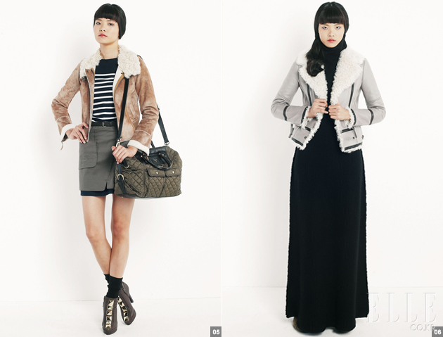 5 마린 무드의 스트라이프 티셔츠. 3만3천원. 흄. 양털이 믹스된 무톤 재킷. 43만8천원. T.I. 블랙 컬러가 믹스된 벨티드 밀리터리 스커트. 17만8천원. EnC. 퀼팅 소재 빅 숄더백. 46×30cm. 39만9천원. 키이스. 볼드한 스터드가 장식된 브라운 부티. 굽 10cm. 가격 미정. 더슈. 6 청키한 니트 맥시 드레스. 가격 미정. 제인송. 블랙 라이닝이 특징인 그레이 무톤 재킷. 가격 미정. 질 by 질 스튜어트.