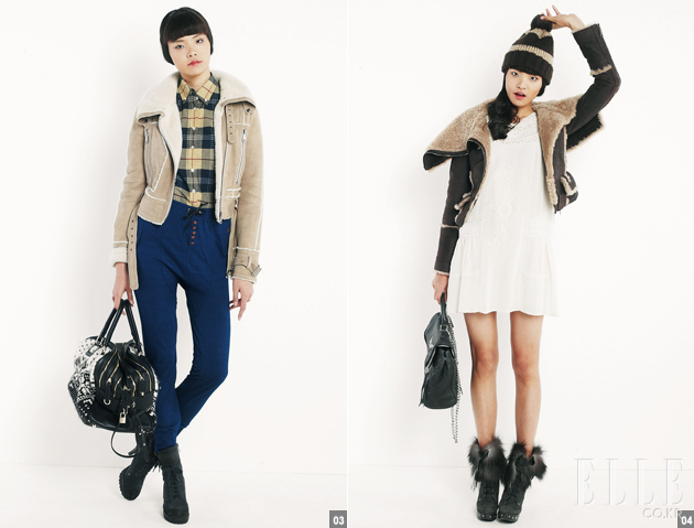 3 보이시한 옐로 체크 셔츠. 2만4천9백원. 뱅뱅. 지퍼 디테일 바이크 무톤 재킷. 가격 미정. 미샤. 블루 스웨트 팬츠. 4만9천원. 자라. 노르딕 니트 소재가 믹스된 지퍼 장식 레더 토트백. 36×30cm. 가격 미정. D&G. 스트랩 부츠. 굽 10cm. 40만원대. 아쉬. 4 걸리시한 엠브로이더리 아이보리 미니드레스. 17만9천원. 자라. 짧은 길이의 투박한 애비에이터 재킷. 4백만원대. 버버리 프로섬. 스터드로 로고를 장식한 레더 체인 숄더백. 35×29cm. 가격 미정. 쟈딕 앤 볼테르. 스터드가 장식된 퍼 트리밍 부츠. 굽 10cm. 가격 미정. 미소페. 폼폼 털모자. 에디터 소장품. |
