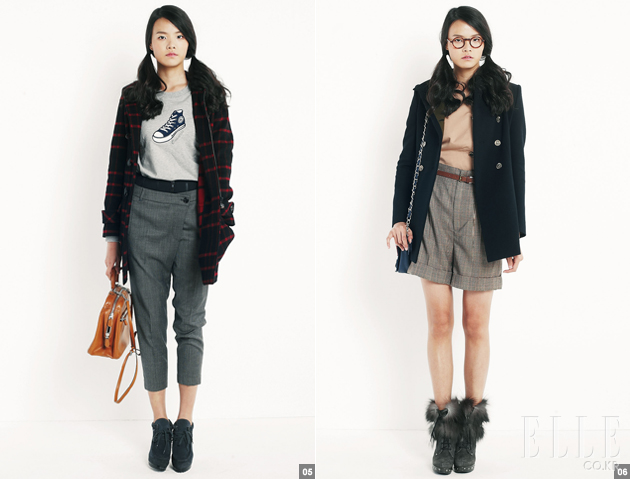 5 스웨트 셔츠. 4만5천원. 컨버스. 레드 체크 더플코트. 39만8천원. 리바이스. 팬츠를 덧대어 입은 듯한 독특한 디테일의 그레이 팬츠. 20만원대. 커밍스텝. 캐멀 백. 36×23cm. 가격 미정. 발렉스트라. 플랫폼 힐. 굽 11cm. 40만원대. 아쉬. 6 누드 컬러 비대칭 셔츠. 24만8천원. EnC. 더블 브레스티드 재킷. 69만5천원. 타임. 벨티드 쇼츠. 9만9천원. 자라. 뿔테 안경. 30만원대. 악셀 by 한독. 체인 백. 29×20cm. 11만8천원. 제시뉴욕. 퍼 트리밍 부츠. 굽 10cm. 가격 미정. 미소페.