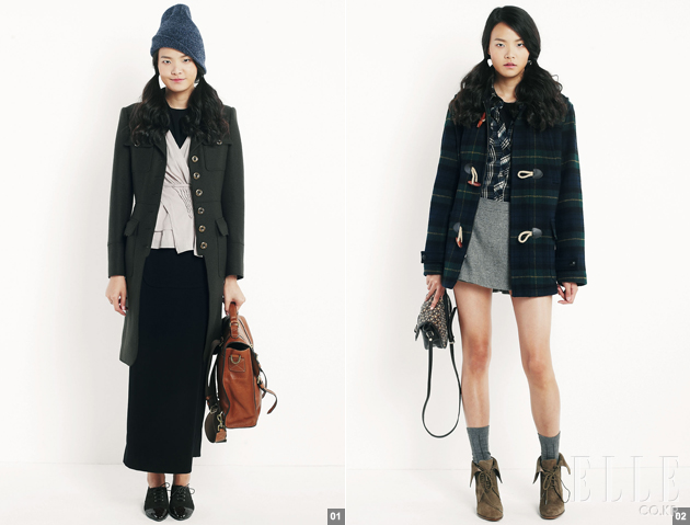 1 블랙 맥시 드레스. 35만8천원. 구호 수트 라인. 랩 블라우스. 19만8천원. EnC. 밀리터리 롱코트. 2백만원대. 버버리 런던. 그레이 비니. 2만9천원. 잭앤질. 브리프케이스. 40×30cm. 1백만원대. 멀버리. 옥스퍼드 슈즈. 14만8천원. 바비 슈즈. 2 플레드 체크 셔츠. 가격 미정. 잭앤질. 더플코트. 53만5천원. 빈폴 레이디스. 랩 스커트. 가격 미정. 쥬시 꾸뛰르. 프티 백. 25×22cm. 8만9천원. 플라스틱 아일랜드. 웨지힐. 굽 11cm. 17만9천원. 자라. | |