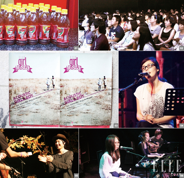 ellegirl’s acoustic day <엘르걸>과 사운드홀릭이 준비한 세 번째 엘르걸 페스타 ‘acoustic girl and boy’가 지난 9월 5일, 홍대 앞 브이홀에서 열렸다. 지금까지와는 조금 다른 차분하고 감성적인 컨셉트로 시작된 엘르걸 페스타. 한층 시원해진 초가을 저녁, 공연장 입구를 가득 메우고 있는 관객들은 한껏 들떠 보였다. 이런 관객들의 마음을 읽기라도 한 듯 가을 분위기를 물씬 풍기는 세트로 꾸며진 무대가 눈에 띄었다. 입구에서 나눠준 립톤 레드티를 받아들고 설레는 마음으로 자리에 앉은 관객들에게 찾아온 첫번째 뮤지션은 ‘도트’. 자신들을 ‘홍대의 걸그룹’이라 소개하며 유쾌한 멘트로 공연을 시작한 도트는 이내 서정적인 건반의 선율과 호소력 짙은 감성 보컬로 관객들을 사로잡았다. 두번째 무대의 주인공은 ‘나루’. 무대 뒤 수줍은 모습과 달리 통기타를 품에 안고 관객앞에 선 나루는 장난끼 넘치면서도 시종일관 편안한 모습이었다. ‘잠’, ‘우주인’, ‘Yet’ 등 1집과 이번 2집에 수록된 곡들을 힘있는 기타 선율과 씩씩한 노래로 선보인 나루는 무대를 마무리하며 비 오는 날씨에도 불구하고 공연장을 찾은 관객들에게 감사하다는 멘트로 잊지 않았다. 이어진 무대는 많은 팬들의 호응이 돋보였던 ‘디어 클라우드’. ‘Last Scene’, ‘무너져’, ‘사라지지 말아요’ 등 귀에 익은 멜로디들로 뜨겁게 무대를 채운 이들은 가을 느낌이 물씬 나는 의상을 준비해 더욱 눈길을 모았다. 네 번째 주인공은 요즘 팬들의 폭발적인 사랑을 받고 있는 ‘옥상달빛’. 팬들의 환호성 소리와 함께 무대에 오른 옥상달빛은 여느 때보다 한층 더 여성스럽고 차분한 모습이었다. 특유의 소녀감성과 고운 음성이 어우러진 화음, 깜찍하면서도 서정적인 느낌을 전달해주는 멜로디언과 실로폰도 모두 여전했다. 특히 마지막 곡 ‘옥상달빛’을 부를 때는 관객들이 함께 박수로 리듬을 맞추며 한마음이 되었다. 마지막 무대는 파워풀한 가창력이 돋보였던 ‘뷰렛’. 성숙한 보컬과 엘르걸 페스타를 위해 어쿠스틱 버전으로 편곡을 해 불러준 ‘마마’, ‘사랑해요’ 등을 연달아 선보였다. 뷰렛은 공연 시작 전 안내된 ‘엘르걸 트위터 팔로잉 이벤트’에 참여한 관객 중 5명을 추첨해 <엘르걸> 정기구독권 당첨자를 발표하며 공연을 마무리했다. 9월의 첫 주말 저녁, 세번째 엘르걸 페스타 ‘acoustic girl and boy’를 찾았던 관객들은 다섯 팀의 뮤지션들과 함께 음악에 젖어들며 특별한 ‘가을맞이’를 하고 돌아갔다. 공연 중간중간 추첨을 통해 증정된 ‘젠하이저 이어폰’과 ‘아이팟 셔플’을 선물받은 행운의 주인공들도 있었다. 세번째 공연을 성공리에 마무리한 음악과 젊음을 대변하는 음악 축제, 엘르걸 페스타. 오는 11월 말, 조금 더 특별해진 모습으로 관객들을 찾아갈 예정이니 기대해도 좋다. |