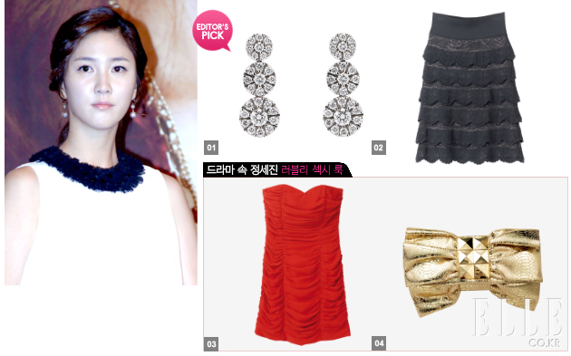 1 세 개의 서클에 여러 개의 다이아몬드를 세팅해 화려함을 주는 이어링. 가격 미정, 다미아니. 2 레이스를 층층이 겹쳐 티어드를 만들어낸 블랙 스커트. 가격 미정, 살바토레 페라가모. 3 여성스러움을 강조한 튜브 톱 미니 원피스. 5만9천원. H&M. 4 보우 형태의 빅 사이즈 클러치 백. 가격 미정, 액세서라이즈.