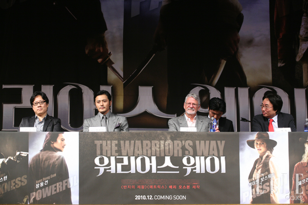 헐리우드 액션 블록버스터 <워리어스 웨이>의 제작보고회는 그 명성에 맞게 부산국제영화제 기간 부산 해운대 그랜드 호텔에서 쇼케이스를 방불케 할 정도의 큰 규모로 화려하게 열렸다. 영화의 첫 공식행사가 된 이번 제작보고회에서는 제작과정이 담긴 프로덕션 메이킹 영상과 서부의 향수와 동부의 신비로움을 잘 표현한 스페셜 하이라이트 영상이 세계 최초로 공개, 영화에 대한 기대감을 한껏 끌어올렸다. 특히 프로듀서인 배리 오스본이 직접 영화의 프로덕션 과정에 대해 이야기하는 시간을 가져 관심이 집중 되었다. 배리 오스본은 <워리어스 웨이>의 시나리오에 매료되어 제작을 결정하게 된 과정, 아시아 최고의 배우 장동건과 아카데미 수상에 빛나는 뛰어난 스탭들과의 작업이 원활하게 진행된 과정에 대하여 브리핑했다. 그의 입을 통해 여러 나라의 배우, 스탭들과 함께 했던 <워리어스 웨이>만의 특별했던 느낌들을 생생하게 들을 수 있었다.