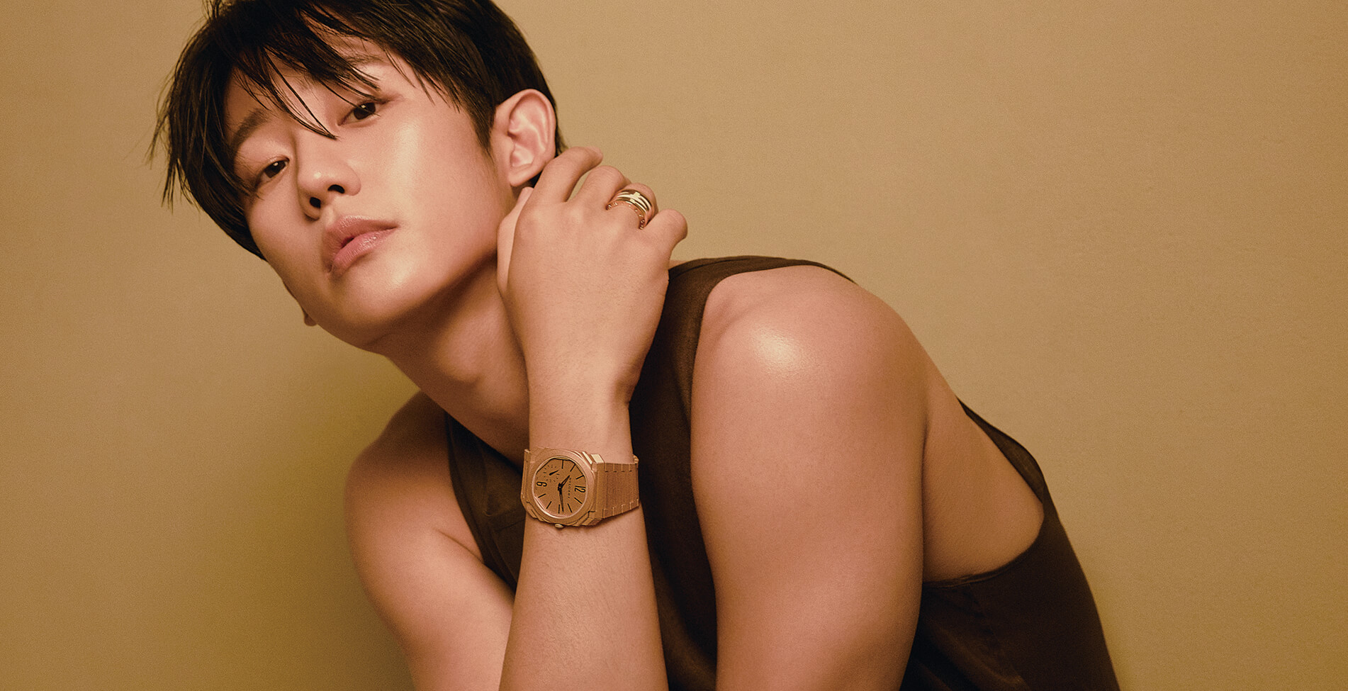 매트한 질감과 가벼운 무게가 특징인 옥토 피니씨모 오토매틱 샌드 블라스트 워치와 로즈골드에 화이트 세라믹을 더한 비제로원 디자인 레전드 링은 모두 Bvlgari. 리넨 슬리브리스 톱과 팬츠는 모두 Jaybaek Couture. 레이스업 슈즈는 Ermenegildo Zegna.