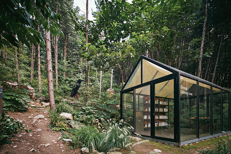 @of.onebook 이국적인 방갈로와 수영장, 푸드코트, 스파와 갤러리까지. 없는 게 없는 테마 리조트 ‘더 스테이 힐링파크’에는 방문자에게 잘 알려지지 않은 비밀 장소가 있다. 바로 숲 속 유리 온실 ‘그린라이브러리’. 리조트 뒤편의 와일드 가든에서도 한참 안으로 들어가야 자태를 드러내는 이 무인 독서당은 신작과 스테디셀러를 비롯해 주로 여행과 자연, 휴식과 관련된 책들로 채워져 있다. 책꽂이에서 한 권을 뽑아 자리에 앉은 뒤 새들의 지저귐과 시냇물 소리 같은 자연 ASMR에 귀 기울일 것. 사방으로 보이는 녹음이 선사하는 평화는 평소라면 손이 잘 가지 않는 책에도 순식간에 몰입하게 만든다. 그린라이브러리 주위는 포토 존 역할까지 하는 각종 테마 정원이 마련돼 있는데 이번 여름에는 수국 정원도 문을 연다는 소식이다.