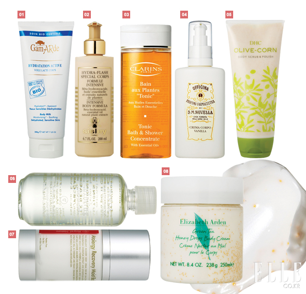 1 끈적임 없이 매끄럽게 발리는 바디 밀크. 200g. 3만9천원. 갸마르드 by 온뜨레. 2 부드러운 피부를 위한 보디로션. 이드라 후레쉬 스빼시알 꼬르 엥땅시브. 200ml. 17만원. 시슬리. 3 탄력 있는 피부를 위한 토닉 바스&샤워 컨센트레이트. 200ml. 2만9천원. 클라란스. 4 보습 효과가 탁월한 보디 크림. 크레마 꼬르포 바닐라. 250ml. 13만8천원. 산타마리아 노벨라. 5 각질 제거와 보습 효과를 두루 갖춘 올리브 바디 스크럽. 200g. 2만2천원. DHC. 6 외부 자극으로부터 민감해진 피부를 진정시켜주는 카밍 컴포지션. 50ml. 3만2천원. 아베다. 7 건조증, 트러블 완화에 효과적인 아톨러지 리커버리 모이스트 바디 크림. 150ml. 6만2천원. 로얄 네이처. 8 천연 벌꿀 성분이 함유된 그린티 허니 드롭 바디 크림. 250ml. 3만7천원. 엘리자베스 아덴.