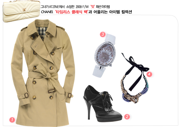 1 버버리 트렌치 코트의 베이지와 샤넬백의 아이보리 컬러의 부드러운 색감이 잘 어울려 유러피안 스타일을 연출할 수 있다. 2 샤넬의 빈티지한 고급스러움은 구찌의 도발적인 섹시함과도 어울린다. 옥스퍼드 스타일의 스틸레토 추천 3 브레게의 왕실 이미지는 샤넬 빈티지 백의 멋스럽고 럭셔리한 정신과 잘 어울린다. 4 랑방의 오트 쿠튀르적인 액세서리와의 매치는 그야말로 사랑스러운 여성의 이미지를 연출할 수 있다. 낭만적인 스타일에 제격인 패브릭 네크리스로 분위기를 내보자. | |