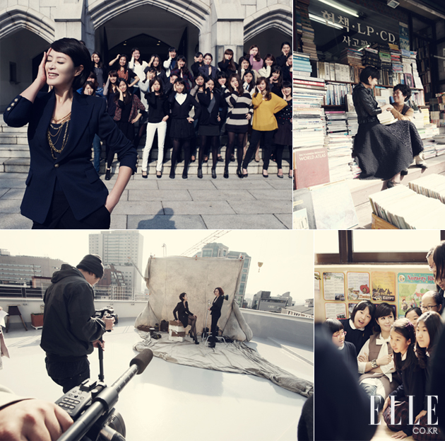 10년도 전이었다. 며칠간 연달아 김혜수를 목격했다. 번화가의 레스토랑에서, 작은 액세서리 상점에서, 주차 빌딩 앞에서…. 그녀는 항상 ‘배우’의 얼굴을 하고 있었다. 시선을 모으려는 유난스러운 제스처는 전혀 없었지만 그녀는 그 자체로 배우의 뉘앙스를 풍겼다. 배우라는 비일상적인 존재를 일상 공간에서 마주하니 생경했다. <이층의 악당>(11월 27일 개봉) 영화 예고편을 보고 나니 김혜수에 대한 기억이 다시금 올라왔다. 무수한 영화 보도 자료들 사이 ‘한석규’ ‘김혜수’ 두 이름이 눈에 들어왔고 ‘<닥터봉>에 둘이 나왔었는데 되게 오랜만이네’ 하는 반가움에 <이층의 악당> 예고편을 본 직후였다. 그녀가 맡은 역할은 별일 아닌 것에도 눈물을 뚝뚝 흘리고, 입만 열면 독설을 퍼붓는 30대 중반의 히스테릭한 미망인. 화면 속 김혜수는 여자들의 집 전용 복장이라 할 만한 차림(후줄근한 티셔츠에 트레이닝 팬츠)이었다. “저는요, 요즘! 잠을 잘 수가 없어요, 잠을!” 앙칼지게 내지르는 목소리는 건너건너 어느 집에선가 싸울 때 들려오는 그것과 다를 바 없었다. 유일성과 보편성, 이질감과 동질감. ‘김혜수’라는 여자에 대해 좀 더 생각하게 됐다. 그녀가 여태까지 해온 다양한 연령과 직종의 여성 캐릭터들에 대해서도. “김혜수도 우리와 같은 여자다.” “김혜수는 우리와 다른 여자다.” 상충되면서도 하나로 통하는 두 가지 생각. 이게 출발이었다. <엘르>는 김혜수를 헤로인으로 새로운 만남을 기획하기로 했다. 보통의 여자 집단과 보통 여자 김혜수의 만남 그리고 특별한 개인과 특별한 배우 김혜수의 만남. 이건 동시대 여자들의 눈으로 그녀들의 생각과 이야기를 공유하려는 <엘르>의 신념과 맞닿아 있으면서도 <이층의 악당>에서 김혜수가 연기하는 ‘우리 주변에 있을 법한 여자’의 연령별 변주이기도 했다. “재미있는 기획인데요?” <엘르>의 제안에 김혜수가 보인 첫 반응. 하지만 재미있기만 할 수는 없는 것이 애초부터 ‘몸이 편한’ 기획은 절대 아니었다. 실제 여성들이 있는 곳, 그러니까 머리부터 발끝까지 곱게 단장하고 스튜디오에 와서 카메라 앞에 서는 것이 아니라 정말 그녀들의 삶이 이뤄지고 있는 현장을 찾아 다녀야 했으니까. 연령대 별 구성의 모티프는 영화 <이층의 악당>에서 얻었다. 이 작품에는 30대 중반의 여주인공 김혜수 외에도 한참 외모에 신경 쓰는 사춘기 딸, 누구와도 살갑게(혹은 오지랖 넓게) 말을 섞는 이웃집 아주머니 등의 여성 캐릭터들이 등장한다.  그렇게 우리는 52명의 여성들을 만날 수 있었다. 중고 서적 전문 ‘공씨책방’을 운영 중인 최성장 어머님, 이화여자대학교 방송국 ‘EUBS’ 소속 11명을 비롯해 40명의 여대생들, 동광초등학교 5학년 2반 임영진을 비롯해 여학생 10명, 그리고 <엘르>의 강주연 편집장까지. <엘르> 사무실이 있는 논현동에서 시작해 이화여자대학교 교정, 신촌로터리에서 동교동 방향 언덕배기를 지나 시흥에 들려 다시 논현동으로 돌아오는 일정이었다(약속 시간을 맞추기 위해 사진가와 함께 새벽녘에 동선을 다 돌아보는 리허설을 하기도). 김혜수와 <엘르>, 여성들이 짧은 시간 안에 또 첫만남에 교감을 만들 수 있을까 노심초사 했으나 기우였다. 이화여자대학교 학생들은 “꺄~” 하며 김혜수에게 반가움을 표했고, 촬영에서도 요즘 청춘 특유의 끼를 마음껏 보여주었다. 촬영 후에는 대강당 맞은편 나무 그늘 아래에서 아름다움, 연기, 남자, 방송에 대한 수다가 한참이었다. 공씨책방의 주인은 우리네 어머님들 모습 그대로 두 손 덥석 잡으며 반겨주었다(한 무더기인 스태프들이 영 불편할 수 있었을 텐데도). 또 남편의 뒤를 이어 16년째 책방을 운영하는 만큼 출판 경향과 작가들에 대한 식견이 깊고 넓은 분이었다. 책 좋아하는 김혜수와 책 얘기가 한참 이어졌음은 물론. 동광초등학교에서는 2층 영어 교실에서 5학년 2반 여학생들이 상기된 얼굴로 김혜수와 <엘르>를 기다리고 있었다. “저는 김수경이고요. 취미는 바이올린이에요.” “제 이름은 김현아고 첼로가 특기에요.” “저는 김민정이에요. 그림 그리기를 좋아해요.”(…) 자기소개가 한 바퀴 돌아가고 곧이어 외모와 미래에 대한 제법 진지한 고민 상담이 쏟아졌다. 단정히 차려입은 푸른 교복이며 반질반질하고 새카만 눈동자, 가을 볕 받은 사과마냥 빠알간 뺨은 모두를 행복하게 했다. 마지막 상대는 <엘르> 강주연 편집장이었다. <엘르> 촬영이 잦은 스튜디오에서 이뤄진 만남. 편집장과 김혜수는 둘 다 블랙 재킷을 입고 있었다. 섹시하면서 시크한 스타일 등 취향이 비슷하다는 점에 금세 통한 눈치. 둘은 패션과 예술, 미디어에 대해 두 시간도 넘게 대화를 이어갔다.  이렇게 한자리에 모인 결과물은 보니, 새벽 4시 30분부터 스태프들에게 모닝 콜을 돌리고 5시부터 부산스레 준비한 것이 헛되지 않았다는 생각이다. 또 <엘르>가 실제 여성들과 밀착된 매거진임을 다시 한 번 상기할 수 있었다. 우리 삶의 과거와 현재와 미래에 같은 꿈을 꾸고 비슷한 정서를 가진 많은 여자들이 있다는, 새삼스럽지만 벅찬 사실도.
