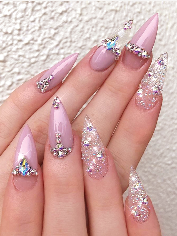 구두 굽처럼 뾰족하고 긴 스틸레토 네일은 아몬드 네일과 헷갈리기 쉽지만 끝이 찔릴 듯 드라마틱하다. <나 혼자 산다>에서 곱창을 맛있게 먹던 마마무 화사의 긴 손톱을 떠올리면 정확하다. 도발적인 무드를 풍기지만 컬러마저 과하면 너무 세 보일 수 있으니 여리여리한 파스텔 톤이나 크림색, 투명한 시스루 네일을 추천한다. 평소 펑크 혹은 고스 룩을 즐긴다면 블랙과 골드, 스터드를 적극 활용해도 좋을 듯.