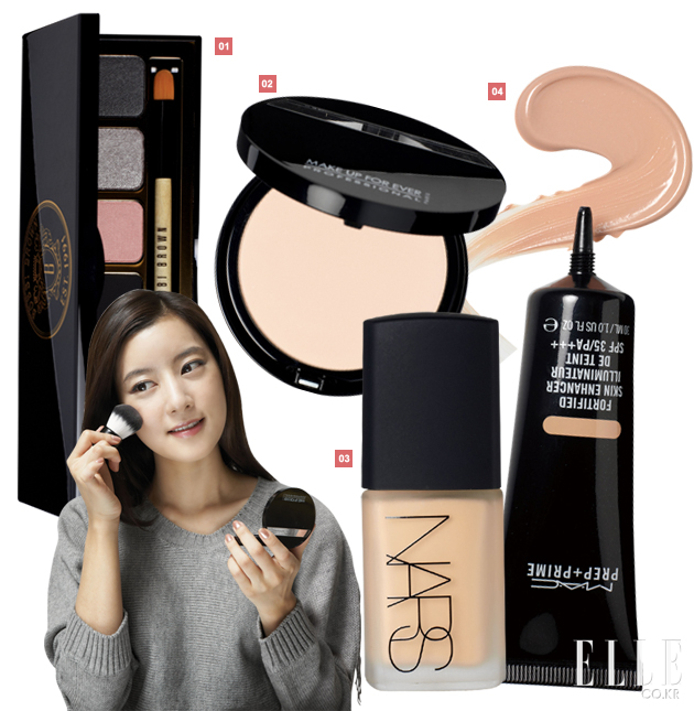 1 바비 브라운 데이 투 나이트 쿨 아이 팔레트. 8만5천원. 2 메이크업 포에버 벨벳 피니쉬 파우더. 4만4천원. 3 나스 피지 쉬어 글로우 파운데이션. 6만원. 4 MAC 프렙 +프라임 포티파이드 스킨 인핸서. 4만8천원.