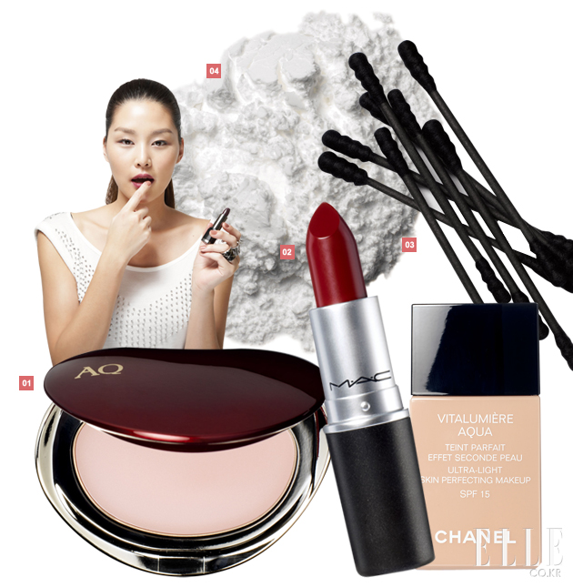 1 코스메 데코르테 AQ 립글로서. 4만6천원. 2 MAC 립스틱, 디바. 2만5천원. 3 샤넬 비타뤼미에르 아꾸아 파운데이션. 가격 미정. 4 메이크업 포에버 HD 파우더. 4만7천원. |