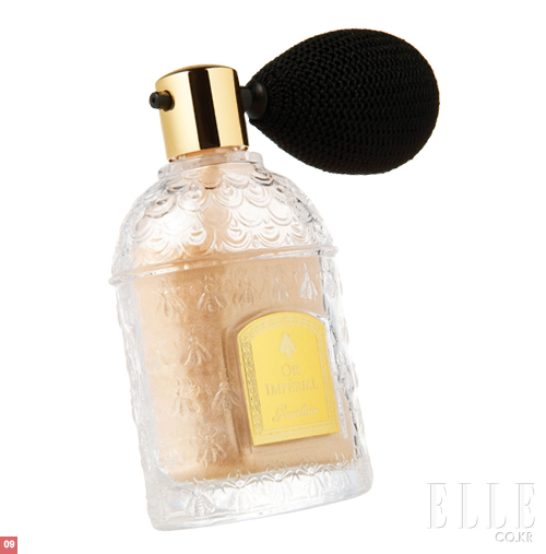 클래식 향수를 연상시키는 고급스러운 보틀이 인상적인 제품으로, 원하는 부위를 향해 펌프를 누르면 향긋한 시머 파우더가 분사되는 형식이다. 얼굴과 몸 어디든 사용 가능하고 횟수에 따라 반짝임의 정도를 조절할 수 있다. 하지만 향기가 다소 강해 향수의 선택에 제약이 따르고 파우더가 날려 분사 범위를 가늠하기 어렵다는 것이 문제. 따라서 의상을 입기 전에 뿌려야 옷에 묻는 것을 막을 수 있고, 향수는 파우더를 사용한 후 약 30분의 시간차를 두고 사용하는 것이 좋다. 17g. 10만5천원. 겔랑. SU YOUNG
