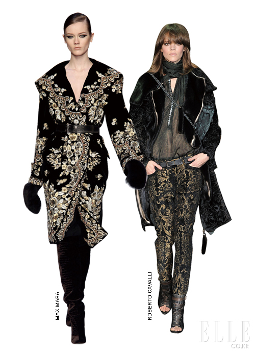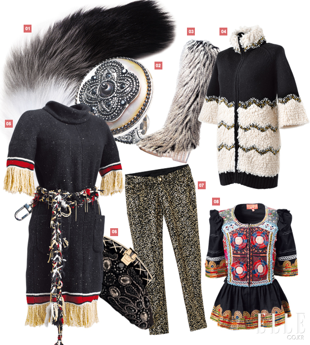 러시안 스타일을 정의하자면 ‘럭셔리 보헤미안’이라고 할 수 있다. 플라워 프린트 대신 화려한 색실로 한 땀 한 땀 공들인 자수가 놓이고, 컬러풀한 구슬 목걸이 대신 세월을 거슬러 올라간 듯한 앤틱 스타일의 액세서리를 매치한다. 여기에 자연의 색깔을 닮은 니트 대신 야생에서 갓 잡은 듯한 퍼 아우터가 그 자리를 대신한다.