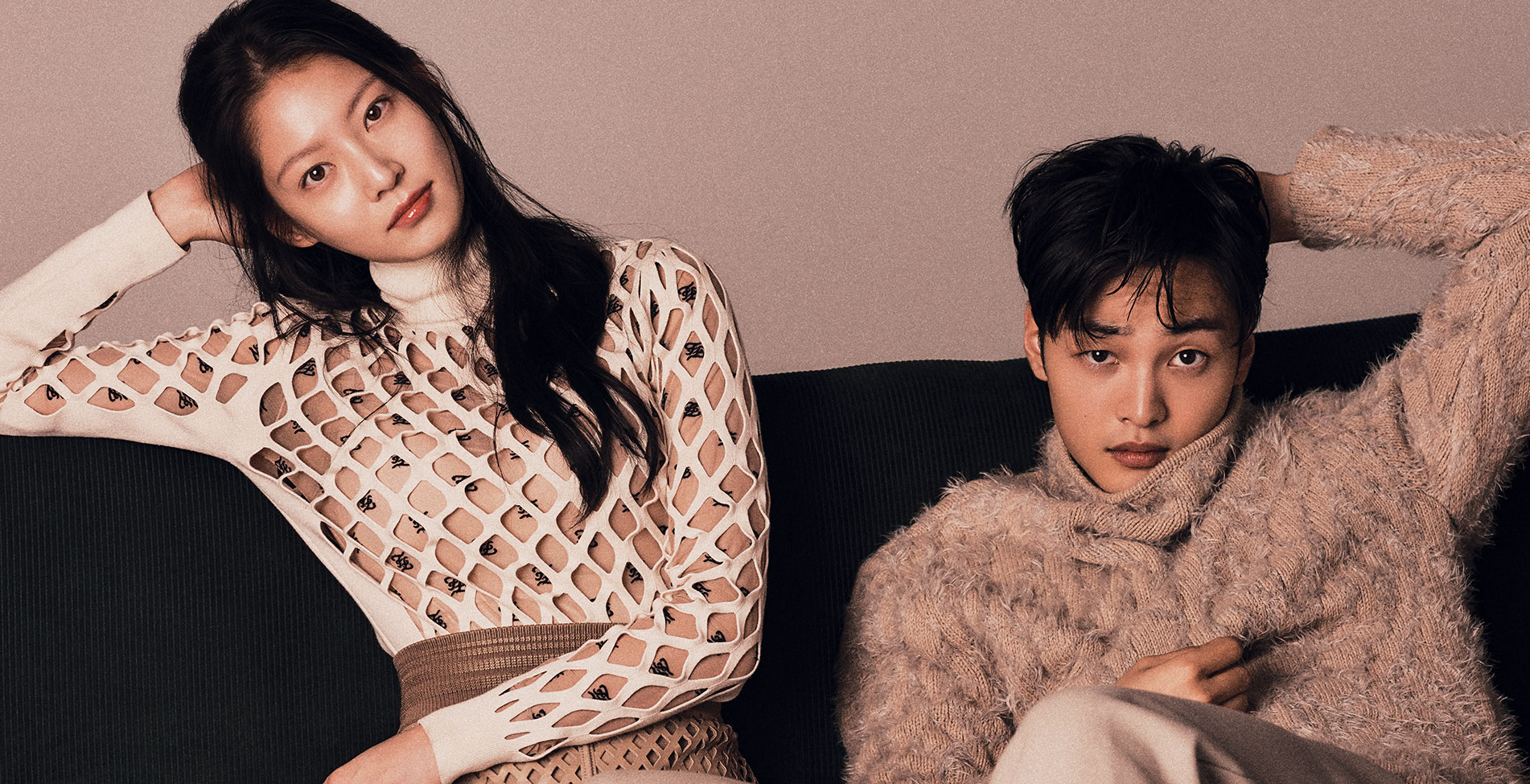 공승연이 입은 뉴 로고 프린트 보디수트와 컷아웃 니트, 터틀넥 스커트는 모두 Fendi. 김민재가 입은 펜슬 니트와 팬츠는 모두 Emporio Armani.