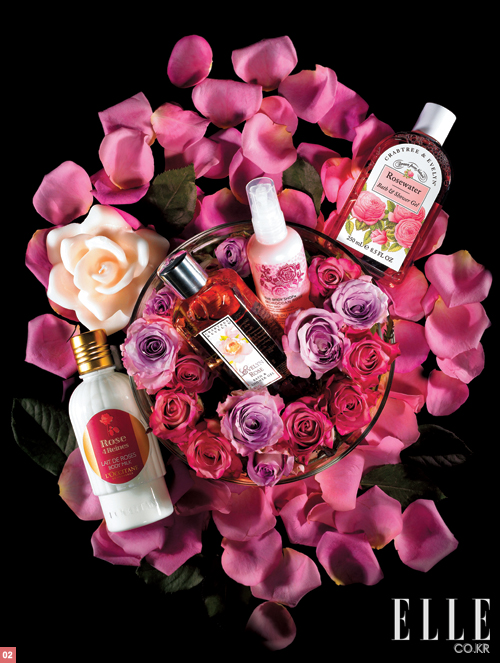| 2 (왼쪽부터 시계 방향으로) 록시땅 로즈 보디 밀크 40,000원 그라스 로즈, 터키시 로즈, 불가리안 로즈, 모로칸 로즈 향이 어우러진 여성스러운 향, 포도씨 오일과 비타민 E 성분이 피부를 촉촉하게 가꾸어줌, 250ml. 산타마리아 노벨라 캔들라 로사로사 68,000원 잔잔한 장미 향이 오래도록 지속되는 향초, 85g. 크랩트리 앤 에블린 로즈 워터 바스& 샤워젤 32,000원 퓨어 로즈 워터가 민감한 피부에 진정 및 보습 효과 제공, 250ml. 더바디샵 모로칸 로즈 바디 미스트 \17,000 모로칸 로즈 이센셜 오일이 샤워 후 건조해지기 쉬운 피부에 촉촉한 수분 공급, 100ml. 크랩트리 앤 에블린 에블린 로즈 바스&샤워 젤 54,000원 에블린 로즈 오일 ,코코넛 오일, 꿀 추출물의 즉각적인 수분 공급 효과, 250ml. |