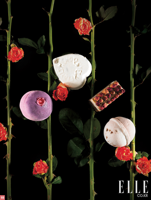| 3 (왼쪽부터 시계 방향으로) 러쉬 섹스밤 9,800원 입욕시 장미 결정체가 물에 피어오르는 발리스틱, 재스민, 일랑일랑, 이센셜 오일 함유. 200g. 러쉬 티스티토스티 11,100원 은은한 장미향이 스트레스와 긴장을 완화해주는 버블 바, 120g. 로얄네이처 로얄 장미 비누 13,700원 로즈 허브 성분이 피부에 활력을 부여하고 모공을 수축시켜 매끄러운 피부결로 가꾸어줌. 100g. 휴고 내추럴 로즈 앤 샌달우드 배쓰 밤 18,000원 미네랄 성분과 로즈, 샌들우드 등 12가지 퓨어 이센셜 오일을 블렌딩한 내추럴 바스 밤. 170g. |