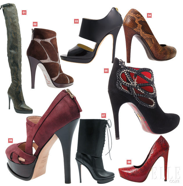 1 버버리 프로섬 3,000,000원대 파이턴 레더 소재, 굽 13cm. 2 르네 카오빌라 by 힐 앤 토트 2,000,000원 스웨이드 소재, 스와로브스키 디테일, 굽 12cm. 3 지미 추 가격 미정 소가죽 소재, 굽 12cm. 4 살바토레 페라가모 가격 미정 뱀피 소재, 굽 11.5 cm. 5 체사레 파조티 by 힐 앤 토트 1,458,000 스웨이드 소재, 스와로브스키 디테일, 굽 11.7cm.