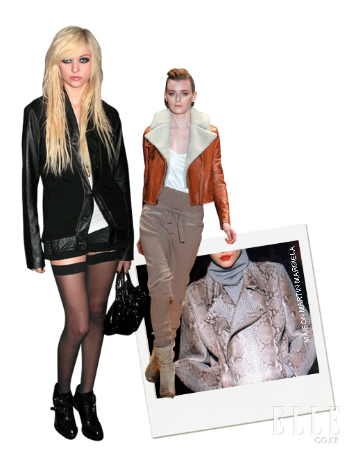 배우이자 록 밴드 ‘더 프리티 레크리스’의 보컬인 테일러 맘슨의 패션 아이덴티티는 록 스타. 언제나 레더 재킷을 잊지 않는 그녀는 부츠, 선글라스 등의 아이템 매칭을 통해 자신만의 록 시크를 완성한다. 어떤 스타일도 시크하게 마무리하는 레더 재킷은 다양한 소재와의 믹스매치를 통해 개성에 맞는 스타일 연출이 가능하다. 특히 이번 시즌에는 퍼 아이템과 함께 매치해 우아하고 럭셔리한 무드를 연출하는 것이 포인트. |